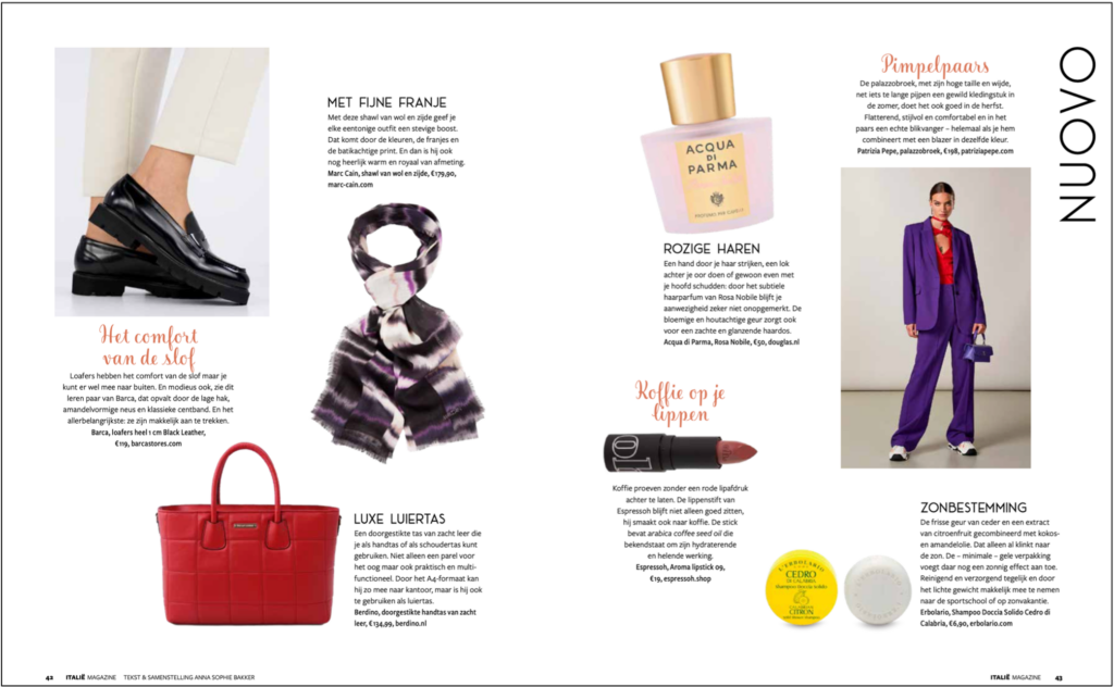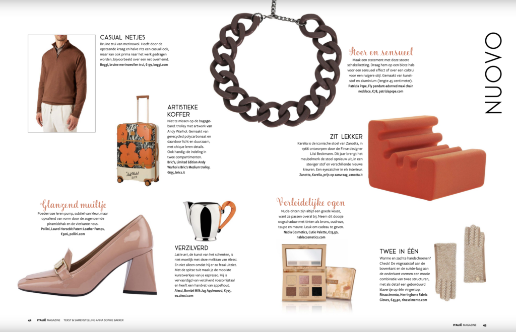 Tijdens mijn stage bij de reismagazines; Leven in Frankrijk, Italië Magazine en Hollands Glorie heb ik veel rubrieken gemaakt en hier passend beeld bij gezocht. Ik heb gespeeld met kleur, vorm en uitstraling van items en hier creatieve teksten bij geschreven.